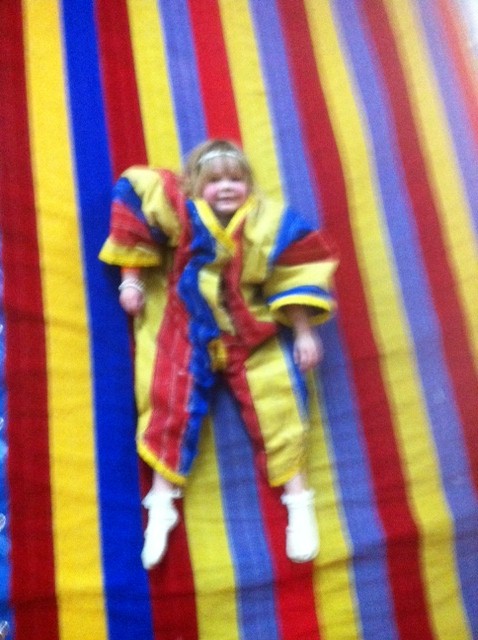 Now if I were a child, the next shot shows what I think would have to be one of the most fun parts — the velcro wall. Apparently the kids didn’t feel the same way. Magoo let me throw her up there once, but then she was DONE with it. Sadly, they don’t have adult sized velcro outfits.
