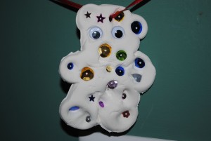 Last week they made these little bear ornaments. It’s hanging on our thermostat until we put up the Christmas tree in a couple of months. It seems an odd project to make in September, but she is quite proud of it. It is very sparkly in true Magoo fashion.