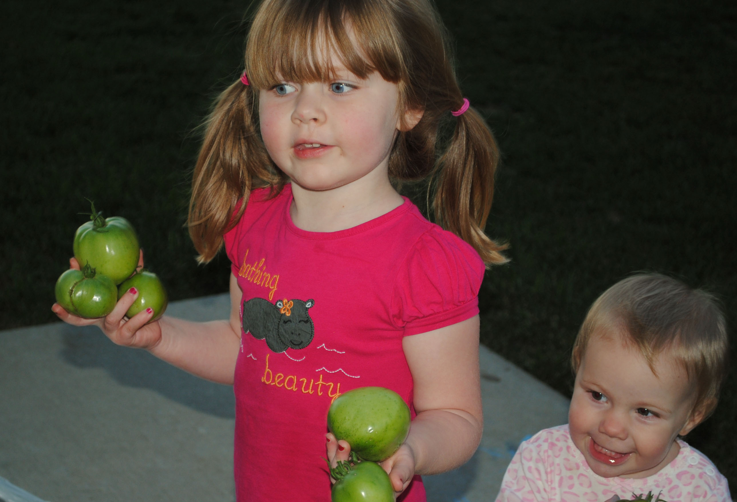 In other news, we decided to pull the plug on our garden this evening. Our tomatoes simply were not turning red, and the ones that did, were getting eaten almost immediately — probably by the chipmunk that sits at our back door harassing my poor dog all day. We have a whole fridge full of green tomatoes that we’ll have to ripen in brown bags. The girls has a blast picking them all.