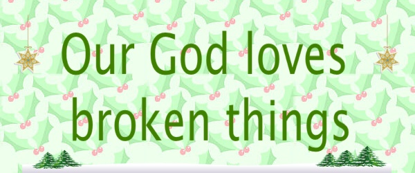 I was sitting in this mess the other day in the waiting room of a doctor’s office, and on the radio, they had a Christian Christmas channel. It was a dull lull in the background until all of a sudden the following words (or a paraphrase thereof) caught my ear and my attention: “God loves broken things.”