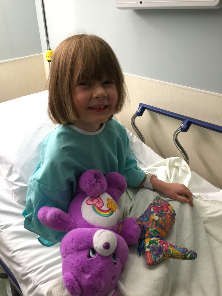 Before the procedure, she sat on the bed and crocheted with her new Care Bear from Grandma and Grandpa. She laughed at the nurses’ and doctors’ jokes. She had no questions. We had already gone over the procedure a few times, so she knew what to expect. She only looked slightly like she was going to cry as they wheeled her back.