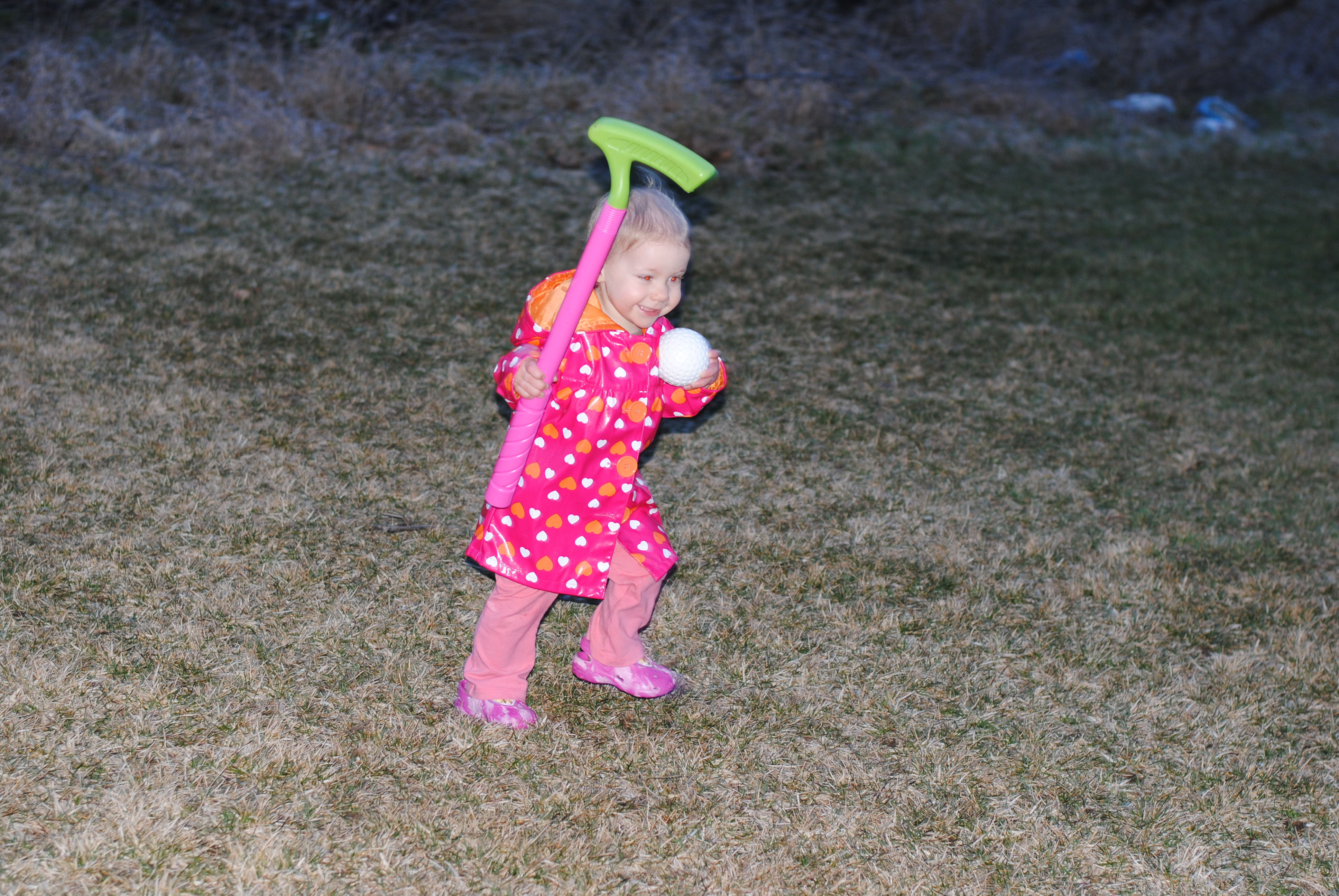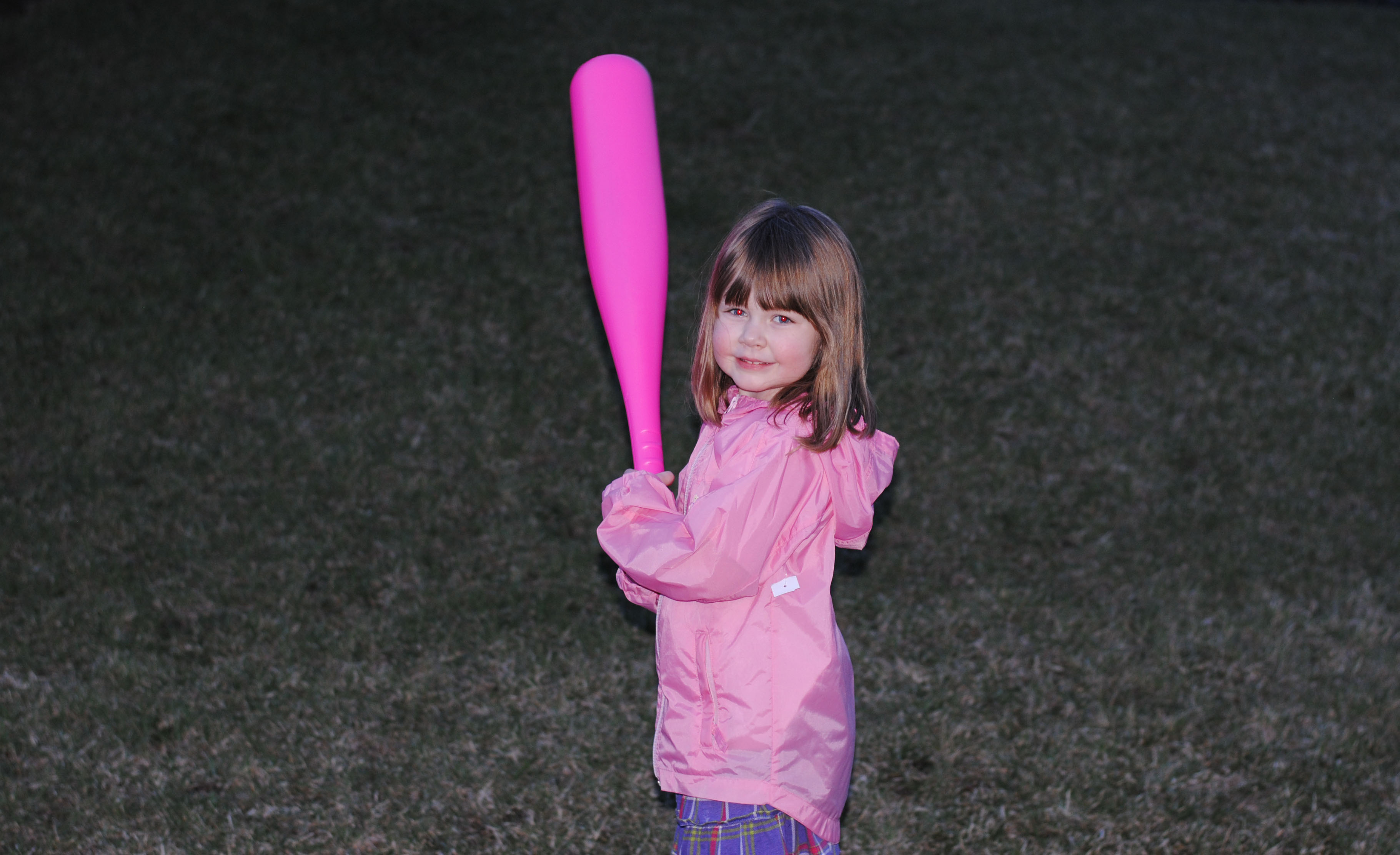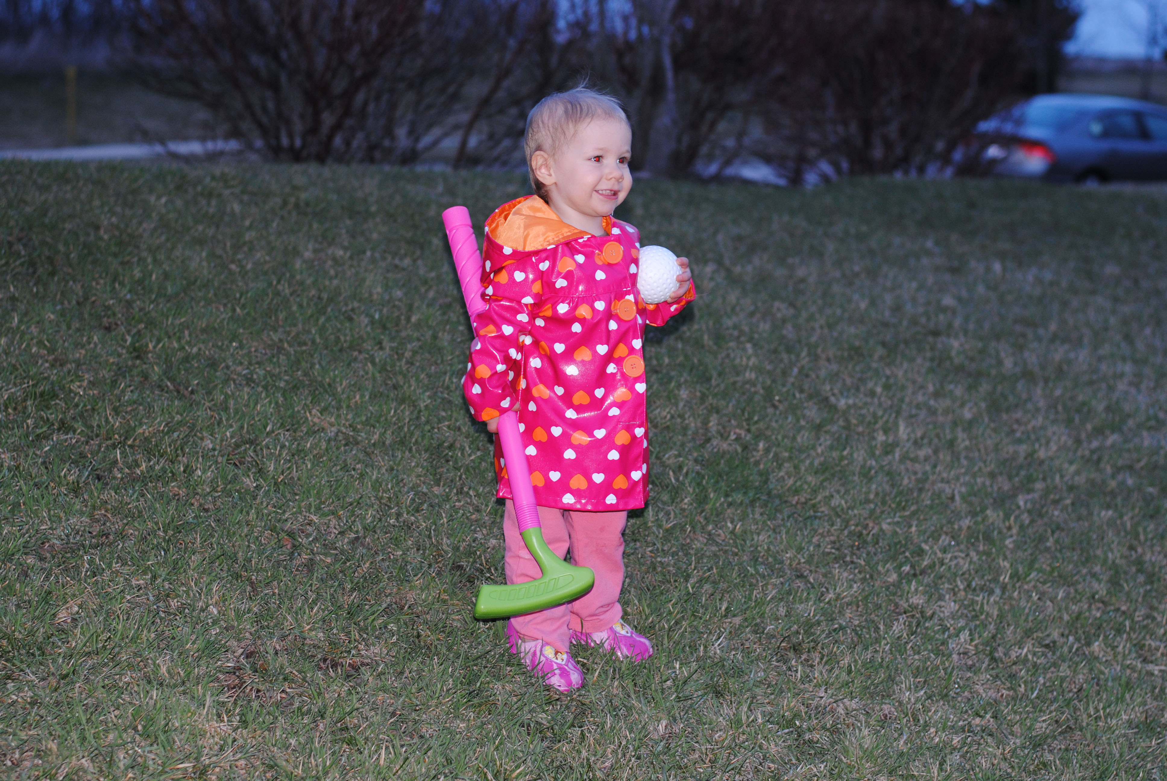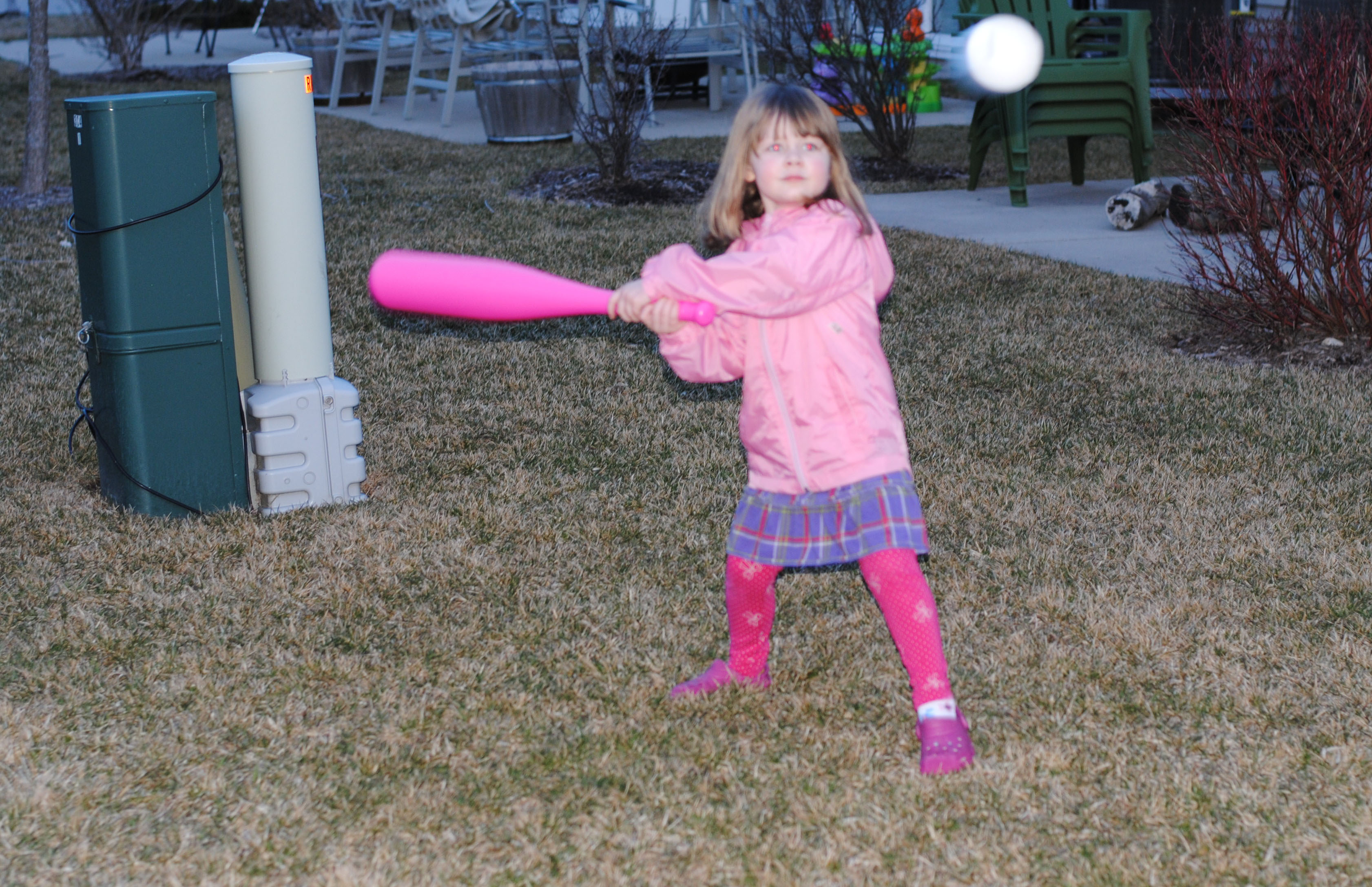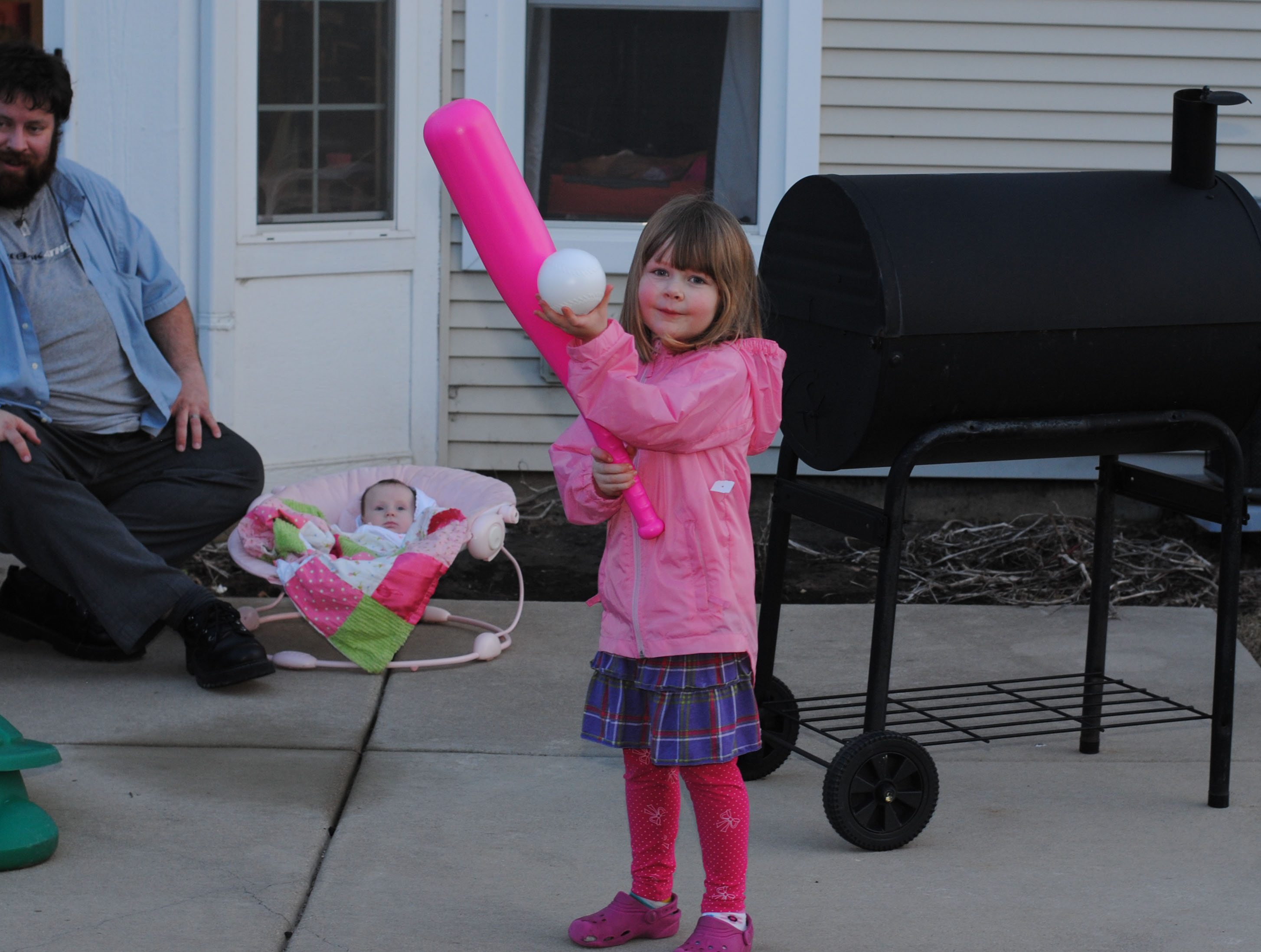So I had a great time today when Magoo took out the wiffle ball bat and ball that the Easter Bunny brought her. TJ and I took turns pitching to her, and I must say, she has a pretty good swing. I actually was really surprised by how far she could hit the ball and how often she could connect considering that she has only held a bat once or twice in her life. Her stance looked so natural and comfortable.